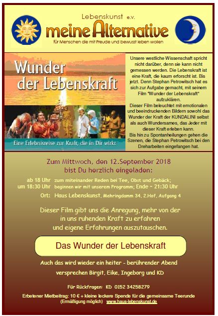 Das Team von "meine Alternative" lädt einmal im Monat mittwochs im Haus Lebenskunst zu einem gestalteten Abend ein, immer mit Gedankenaustausch.