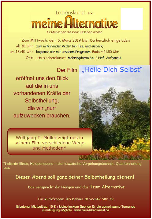 Das Team von "meine Alternative" lädt einmal im Monat mittwochs im Haus Lebenskunst zu einem gestalteten Abend ein, immer mit Gedankenaustausch.