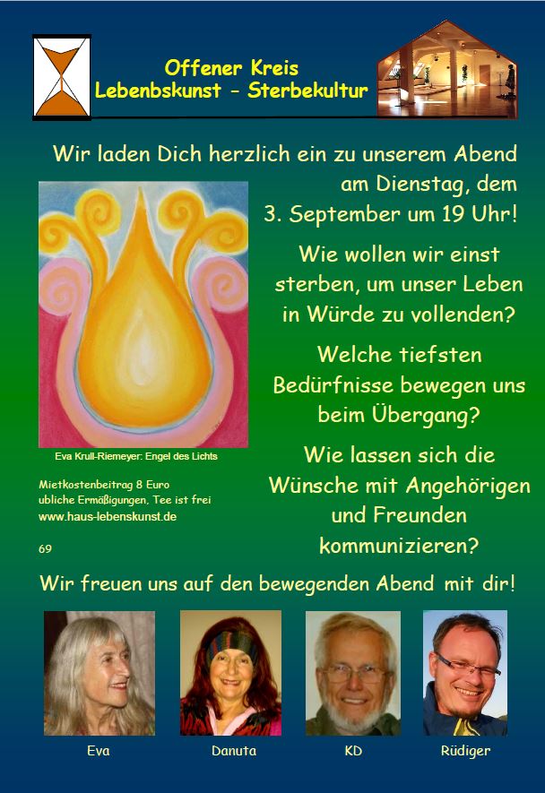 Der Offene Arbeitskreis Lebenskunst - Sterbekultur lädt einmal im Monat dienstags im Haus Lebenskunst ein zu einem Gedankenaustausch.