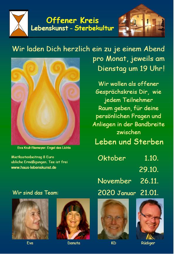 Der Offene Arbeitskreis Lebenskunst - Sterbekultur lädt einmal im Monat dienstags im Haus Lebenskunst ein zu einem Gedankenaustausch.