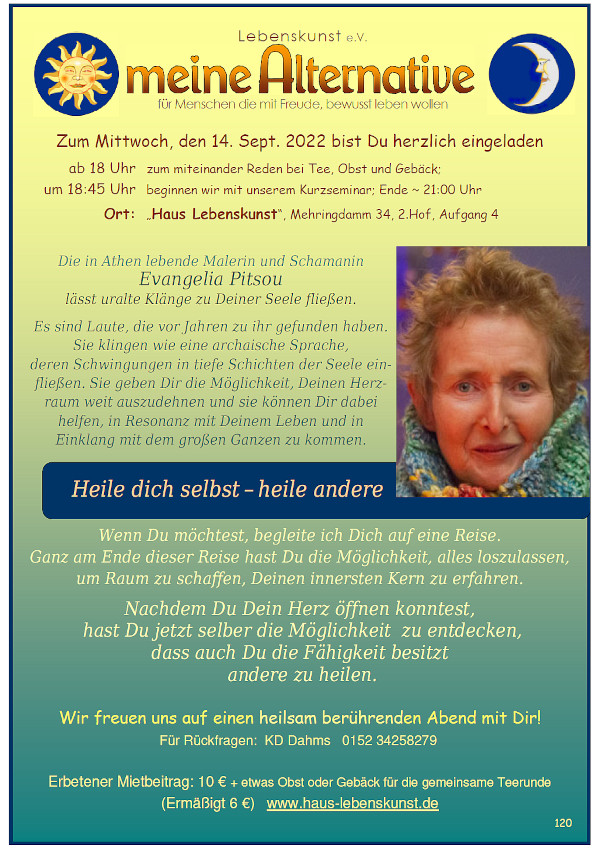 Das Team von "meine Alternative" lädt einmal im Monat mittwochs im Haus Lebenskunst zu einem gestalteten Abend ein, immer mit Gedankenaustausch.