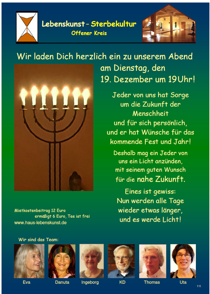 Der Offene Arbeitskreis Lebenskunst - Sterbekultur lädt einmal im Monat dienstags im Haus Lebenskunst ein zu einem Gedankenaustausch.